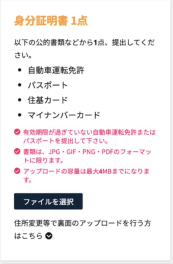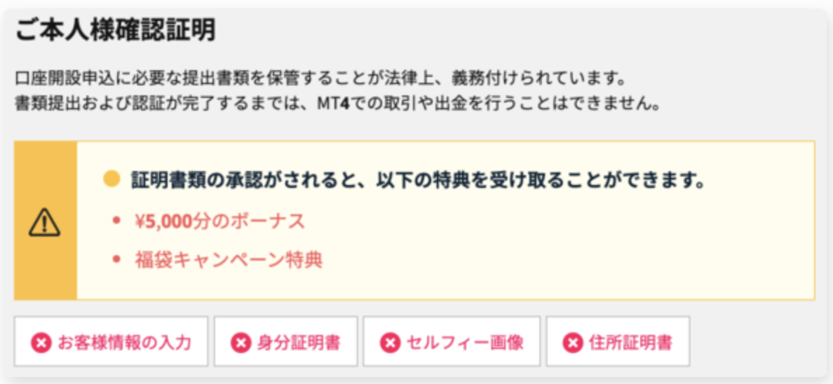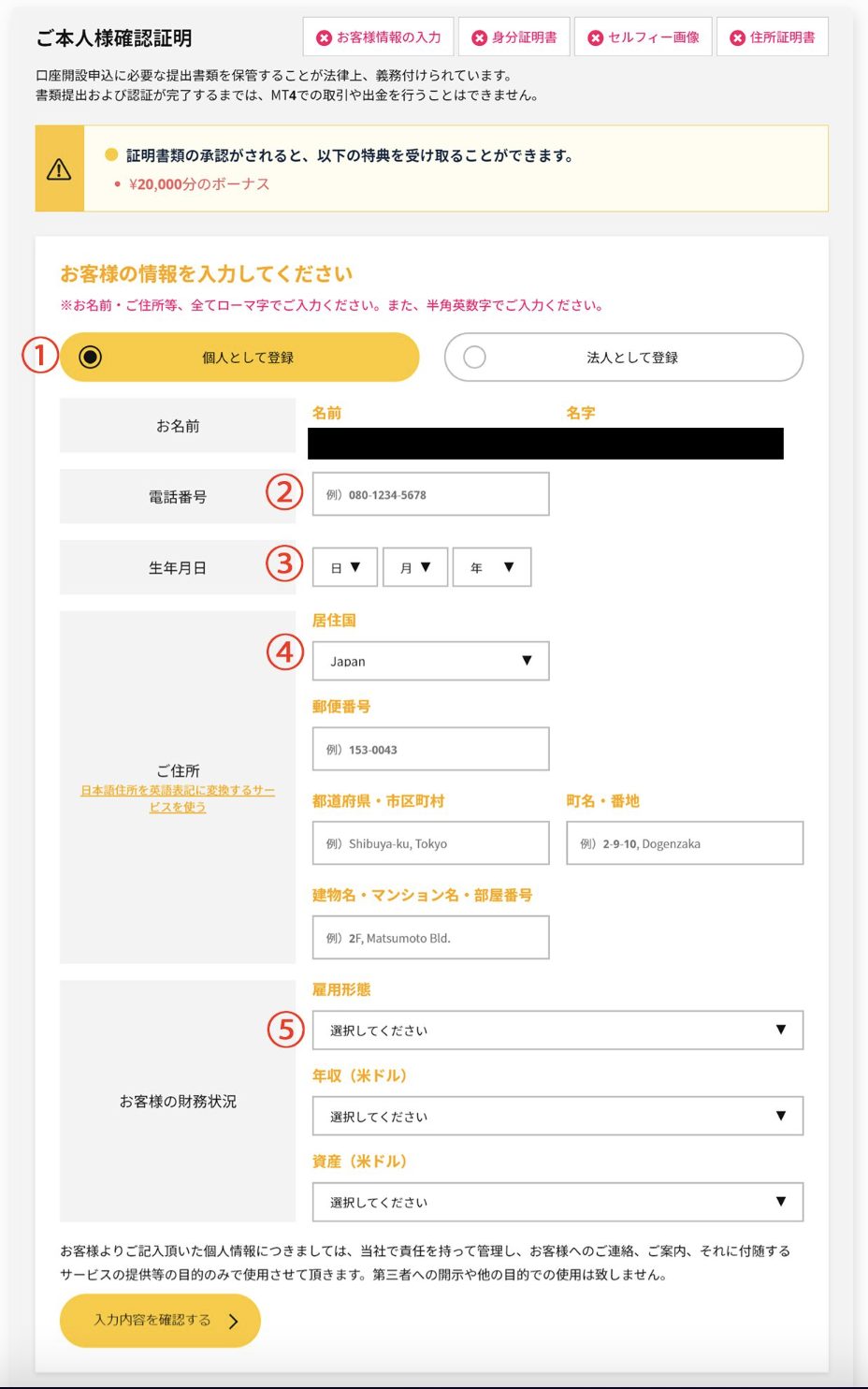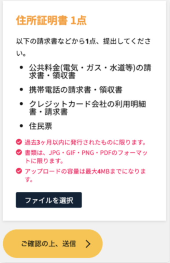 入力したメールアドレスに登録完了メールが送られてくるので、メモまたはバックアップを取った上で保管してください。 IS6FXのマイページにアクセスして、登録したメールアドレスと口座開設時に設定したパスワードでログインします。 IS6FXでは国を日本に選択すると国際番号の「+81」があらかじめ入力された状態になりますので、携帯電話番号は冒頭の0を抜いた10桁を入力してください。 ログインすると、未入力項目を通知する画面が表示されますので、[ご本人確認]ボタンをクリックし、個人情報を入力する画面に進みます。 下記画面の①の「個人として登録」を選択し、電話番号、生年月日、住所、財務状況を入力してください。 全ての情報を入力したら、ページ下部にある[入力内容を確認する]というボタンをクリックしてください。 情報が正しく入力されていることを確認したら、送信します。 続いて、本人確認書類の提出に進みます。 途中で電話番号認証を求められた場合は、 を入力してください。 本人確認書類の提出は、郵送ではなく書類の画像データなどをアップロードする形で行いますので、手間はそれほどかかりません。 ユーザー情報の入力が完了すると、3つの必要書類の提出画面に移動しますので、書類をアップロードしていきましょう。 本人確認書類には、以下の3つの種類が必要です。 それぞれ詳説します。 IS6FXで有効な身分証明書として利用できるものは、以下の4種類となります。 有効期限内の上記書類をスマートフォンなどで撮影し、JPG・GIF・PNG・PDFのいずれかのデータ形式にして[ファイルを選択]からアップロードしてください。 セルフィー画像は、登録者本人と提出する身分証明書が一緒に写っている写真になります。 身分証明書を正面から見える形で持ち、スマートフォンで自撮りします。 そして撮った写真をJPG・GIF・PNG・PDFのいずれかのデータ形式にして[ファイルを選択]からアップロードしてください。 ※画像が不明瞭の場合、再提出を求められることがありますので、自分の顔と証明書の内容がはっきりと写るようにスマートフォンの位置を調整してください。 IS6FXで有効な住所証明書として利用できるものは、以下の4種類となります。 ※最近の公共料金や携帯番号の請求書はWEB化されており住所が載っていないことも多いです。 3ヶ月以内に発行された上記書類をスマートフォンなどで撮影し、JPG・GIF・PNG・PDFのいずれかのデータ形式にして[ファイルを選択]からアップロードしましょう。 上記3種類の書類のアップロードがすべて完了したら、[ご確認の上、送信]ボタンをクリックしてください。 アップロードが正しく行われていれば、以下のようなメールが届き、IS6FXの口座開設手続きは全て完了となります。 本人確認書類の内容をIS6FXが確認するまでには1営業日ほど時間がかかりますので、あとは本人確認が完了するまで待ちましょう。 再提出を求められた場合は、メール案内の指示に従って該当する書類を再度提出してください。
